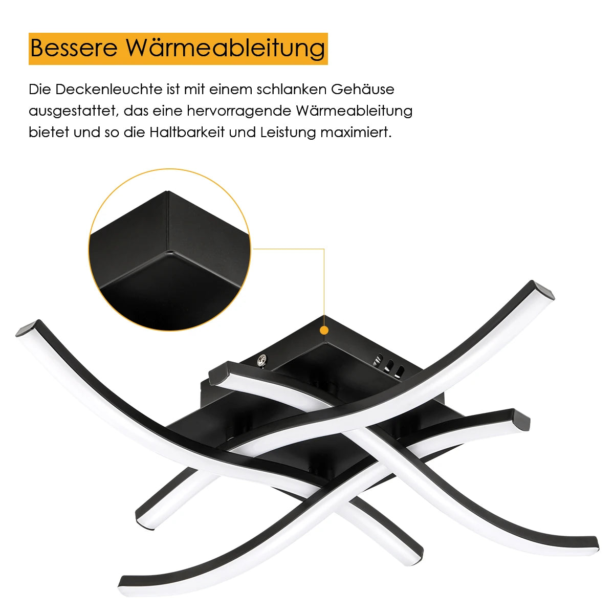 Breng tijdloze elegantie in uw interieur met deze stijlvolle 4-armige LED plafondlamp. Het gebogen aluminium design in zwart combineert moderne esthetiek met praktische functionaliteit. Met 4 dimbare LED-lichtbronnen (totaal 48W) creëert u moeiteloos de perfecte sfeer - van helder werklicht tot zachte ambiance.